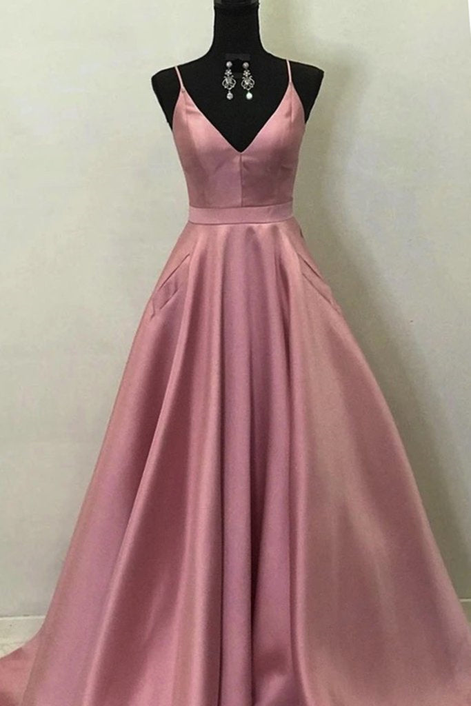 A Line V Neck Open Back Pink Satin Long Prom Dresses, Open Back Pink Formal Graduation Evening Dresses