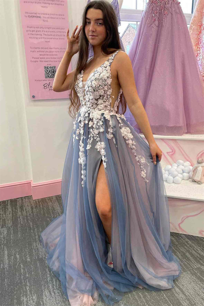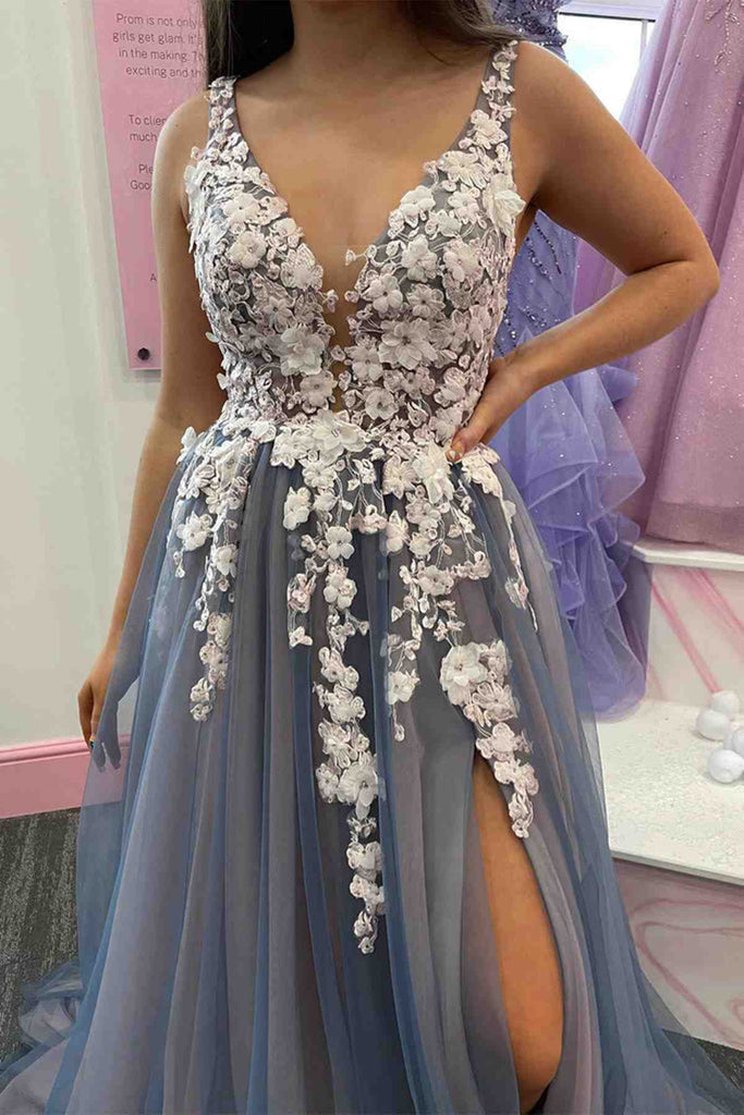 Elegant V Neck Smoke Gray Tulle Long Prom Dresses with Lace Flowers, Smoke Gray Tulle Formal Graduation Evening Dresses with High Slit EP1842