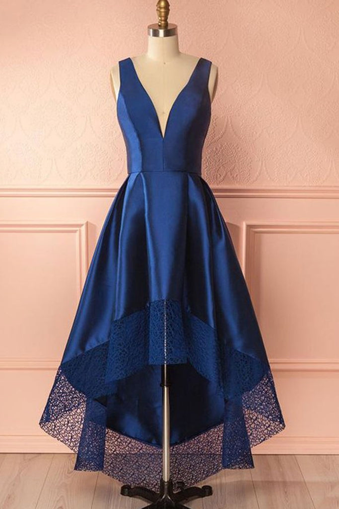 High Low V Neck Blue Satin Prom Dresses, Open Back Blue Formal Dresses, Blue Evening Dresses EP1378