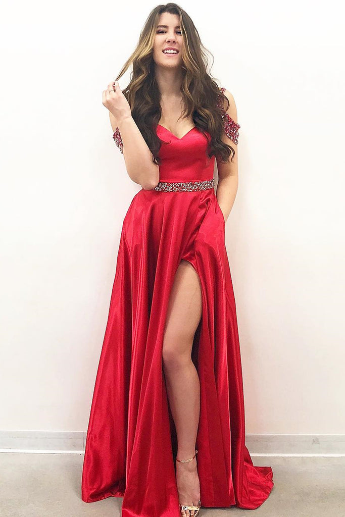 Off Shoulder Green/Red Satin Long Prom Dresses with Beadings, Off the Shoulder Green/Red Formal Graduation Evening Dresses EP1769