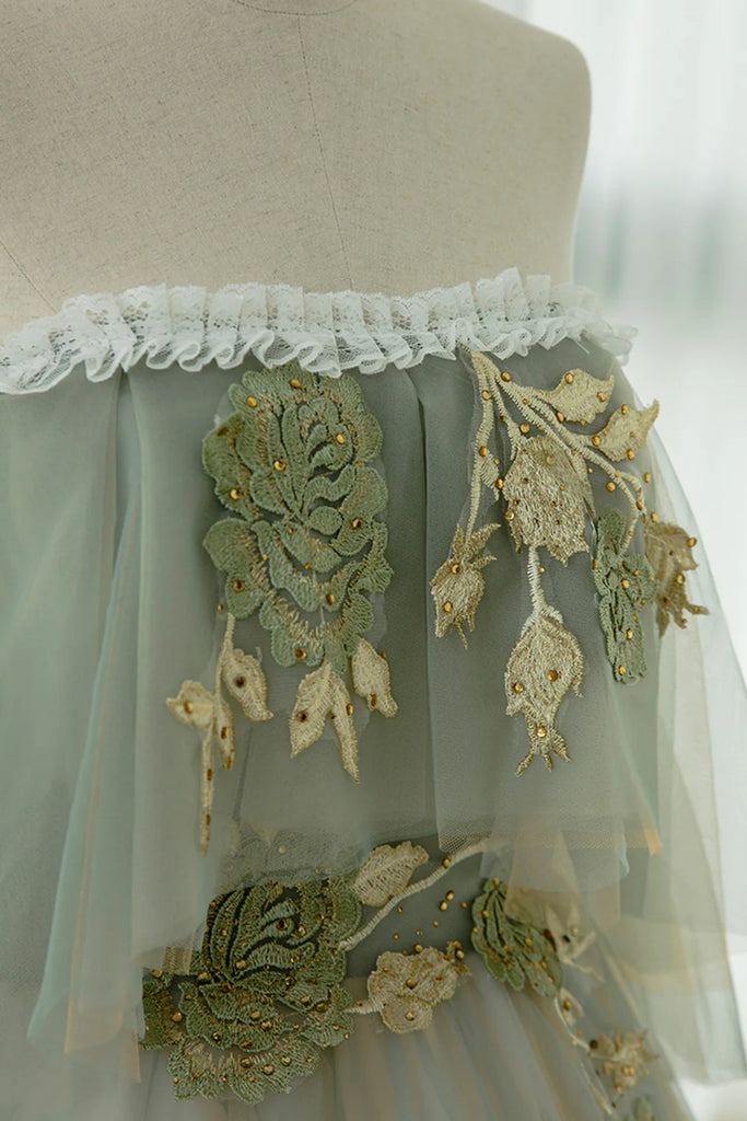 Off the Shoulder Green Lace Floral Prom Dresses, Green Tulle Floral Long Formal Evening Dresses