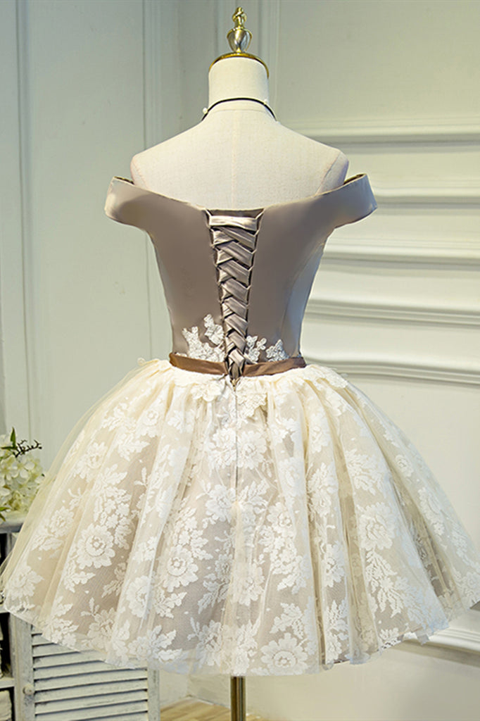 Off the Shoulder Short Champagne Lace Prom Dresses, Short Chamapgne Lace Graduation Homecoming Dresses