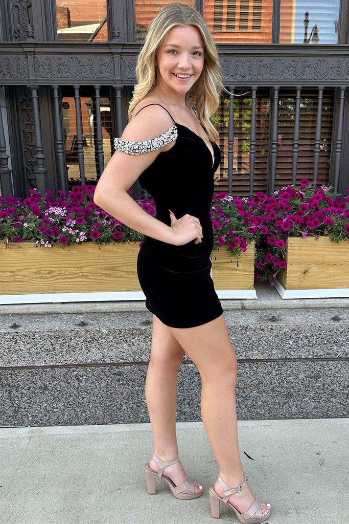 Off the Shoulder V Neck Short Black Prom Dresses, Off Shoulder Short Black Formal Homecoming Dresses