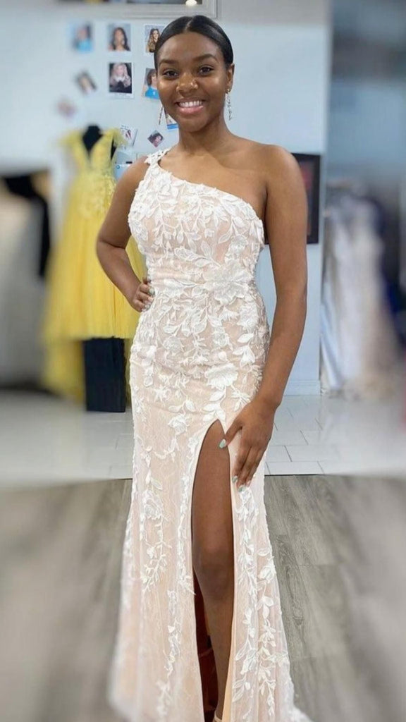 One Shoulder Mermaid Backless Champagne Lace Long Prom Dresses with High Slit, Mermaid Champagne Formal Dresses, Champagne Lace Evening Dresses EP1588