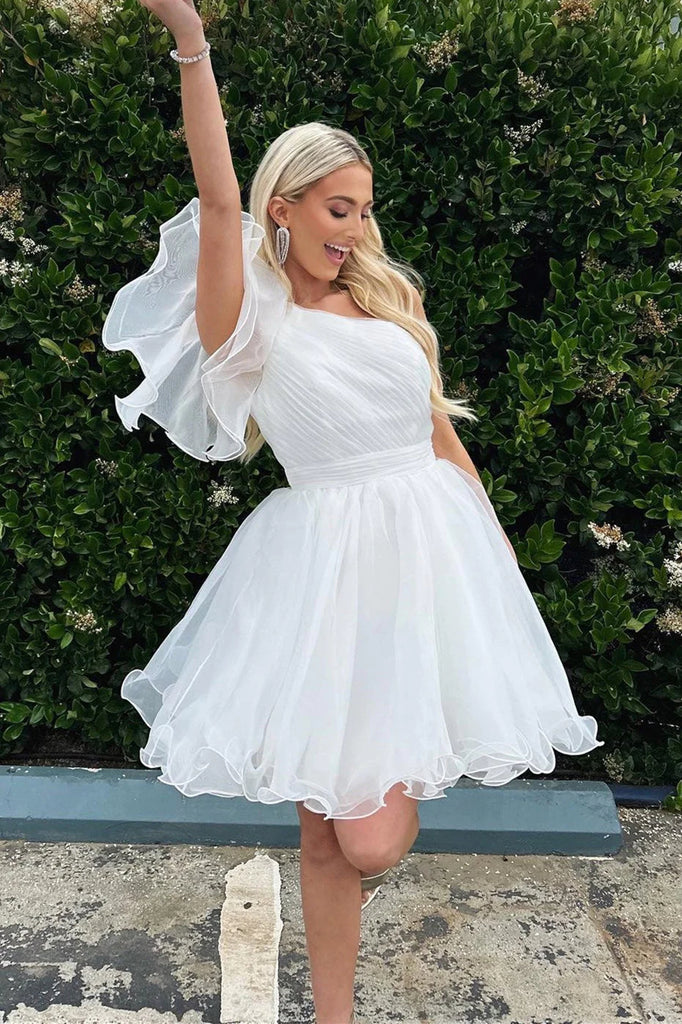 One Shoulder White Purple Red Tulle Prom Dresses, One Shoulder Short Formal Homecoming Dresses