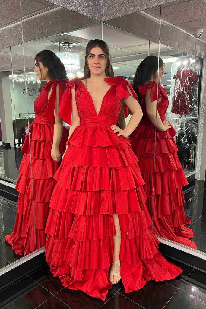 Plunging V Neck Ruffled Long Prom Dresses, V Neck Ruffled Long Formal Evening Dresses