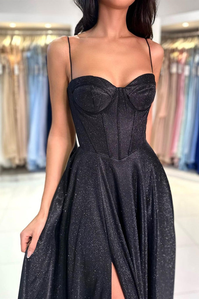 Shiny Black High Slit Long Prom Dreses, High Slit Shiny Formal Evening Dresses