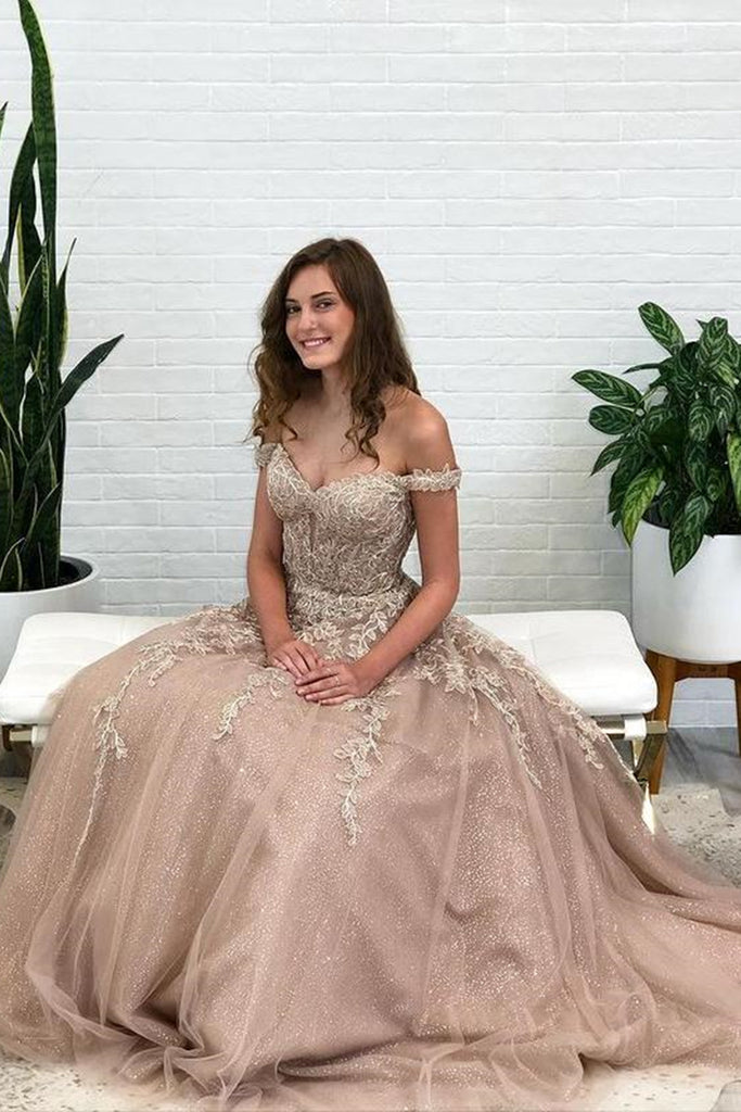 Shiny Off Shoulder Champagne Lace Long Prom Dresses, Champagne Lace Formal Dresses, Champagne Evening Dresses EP1590