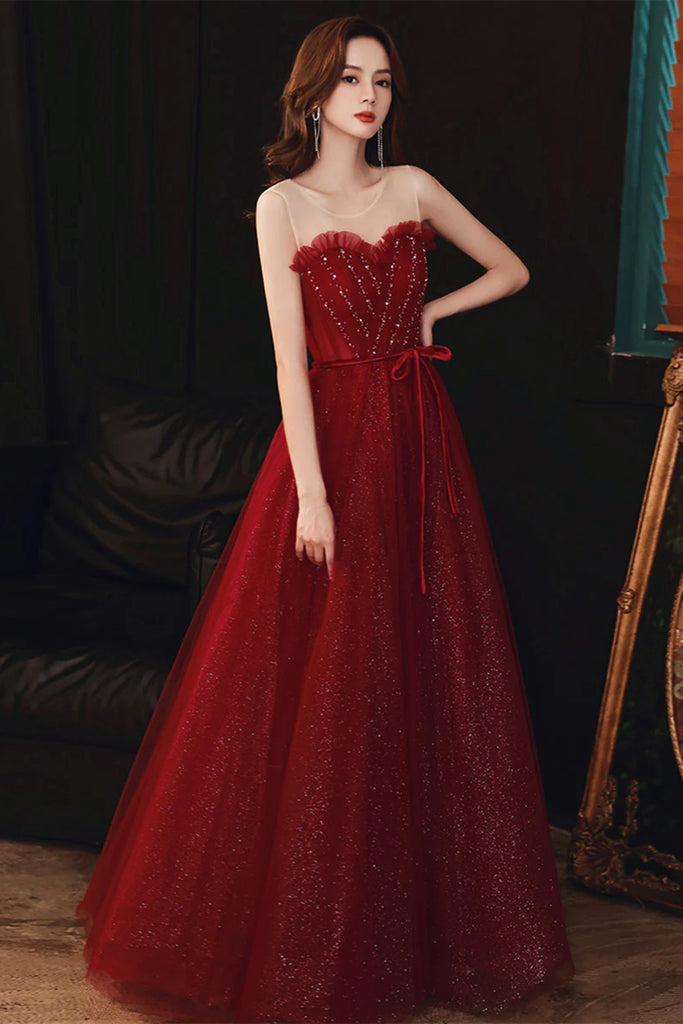 Shiny Round Neck Burgundy Long Tulle Prom Dresses, Wine Red Long Tulle Formal Evening Dresses