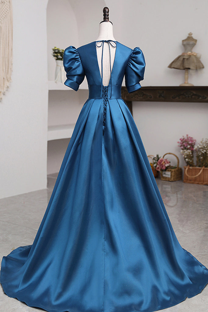 Short Sleeves Peacock Blue Long Prom Dresses, Peacock Blue Long Formal Evening Dresses