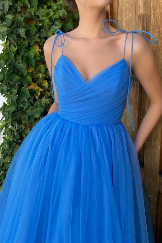 Short Tea Length Blue Tulle Prom Dresses, Tea Length Short Blue Tulle Graduation Homecoming Dresses