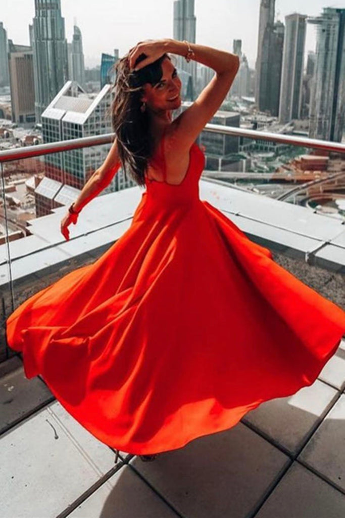 Simple V Neck Red Tea Length Prom Homecoming Dresses, Tea Length Red Formal Graduation Evening Dresses EP1886