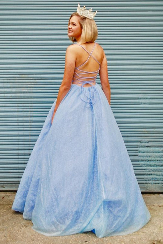 Sparkly V Neck Backless Light Blue Long Prom Dresses, Open Back Light Blue Formal Dresses, Shiny Blue Evening Dresses