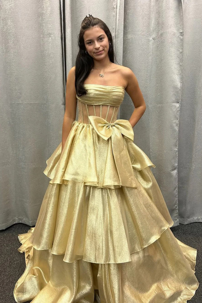 Strapless Gold Organza Layered Long Prom Dresses, Gold Organza Layered Long Formal Evening Dresses
