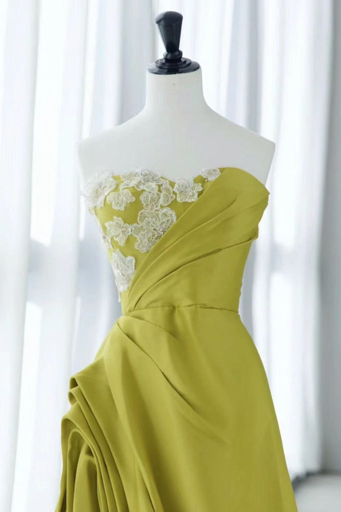 Strapless Green Satin Floral Prom Dresses, Green Long Floral Long Formal Evening Dresses