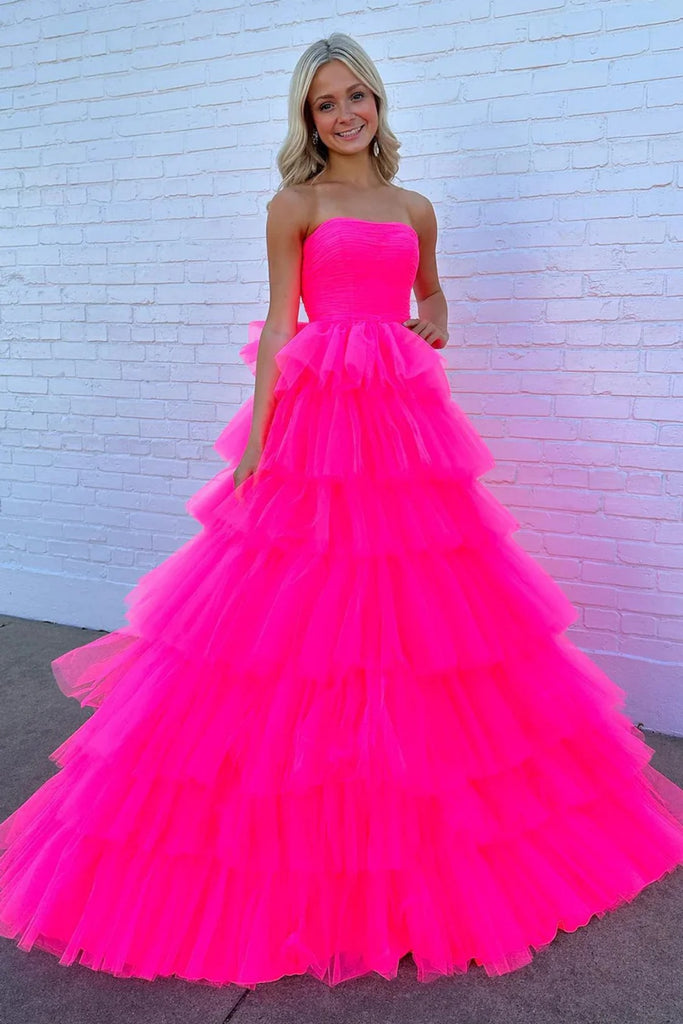 Strapless Hot Pink Tulle Long Prom Dresses, Hot Pink Long Formal Evening Dresses