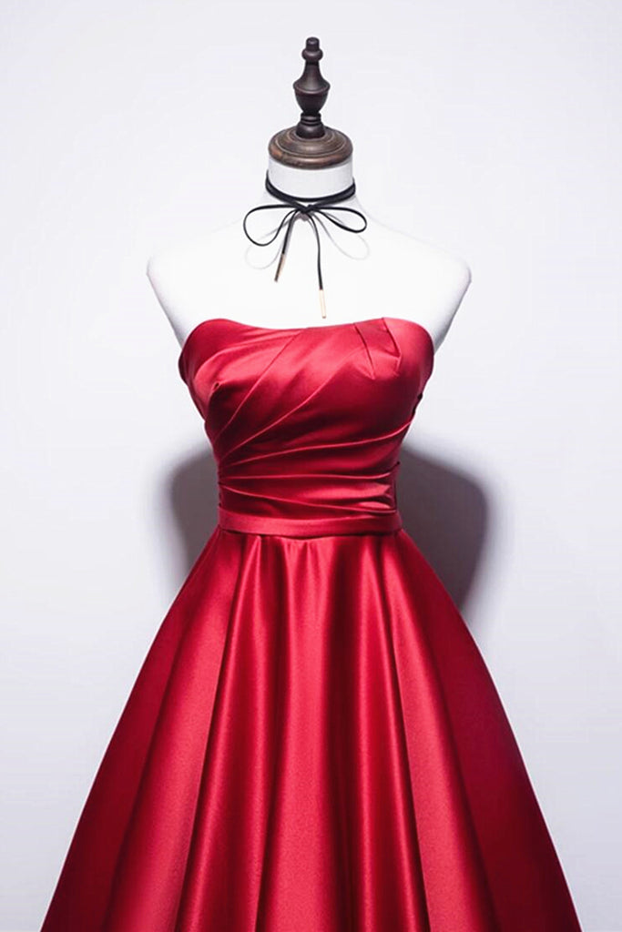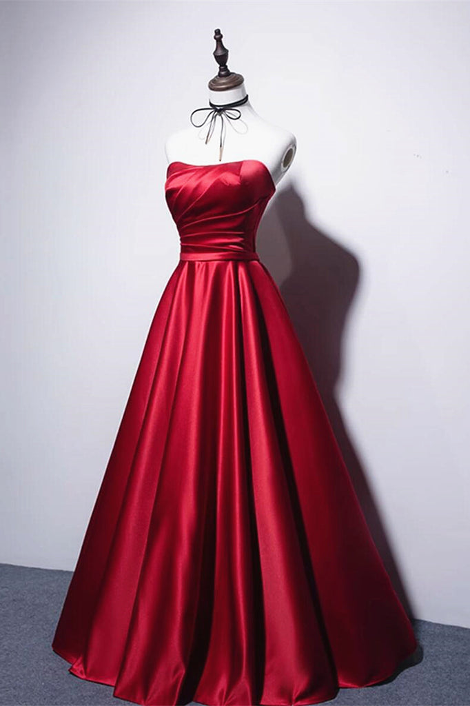 Strapless Red Satin Long Prom Dresses, Dark Red Long Formal Evening Dresses
