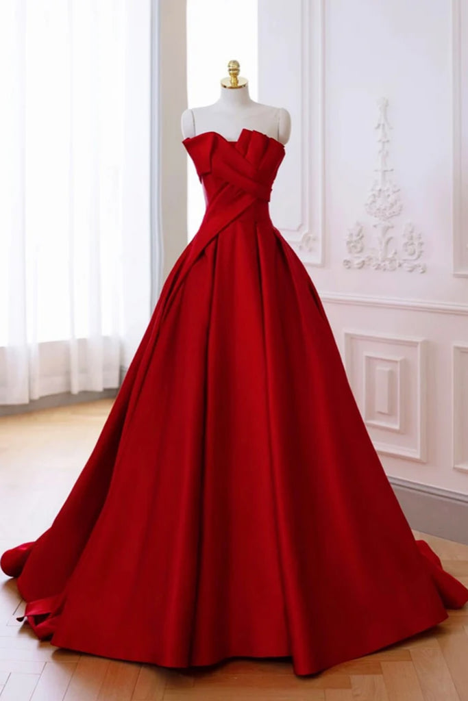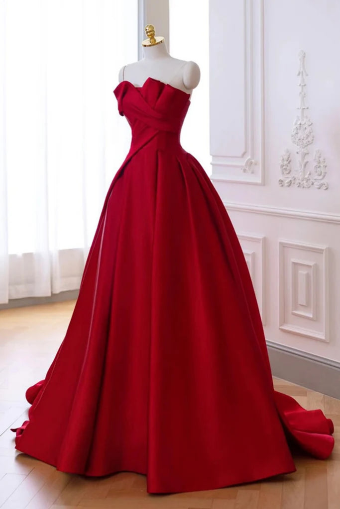 Strapless Red Satin Long Prom Dresses, Red Satin Long Formal Evening Dresses
