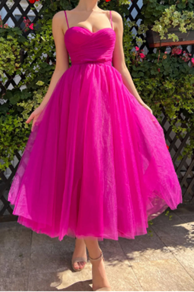 Tea Length Hot Pink Prom Dresses, Tea Length Hot Pink Formal Homecoming Dresses