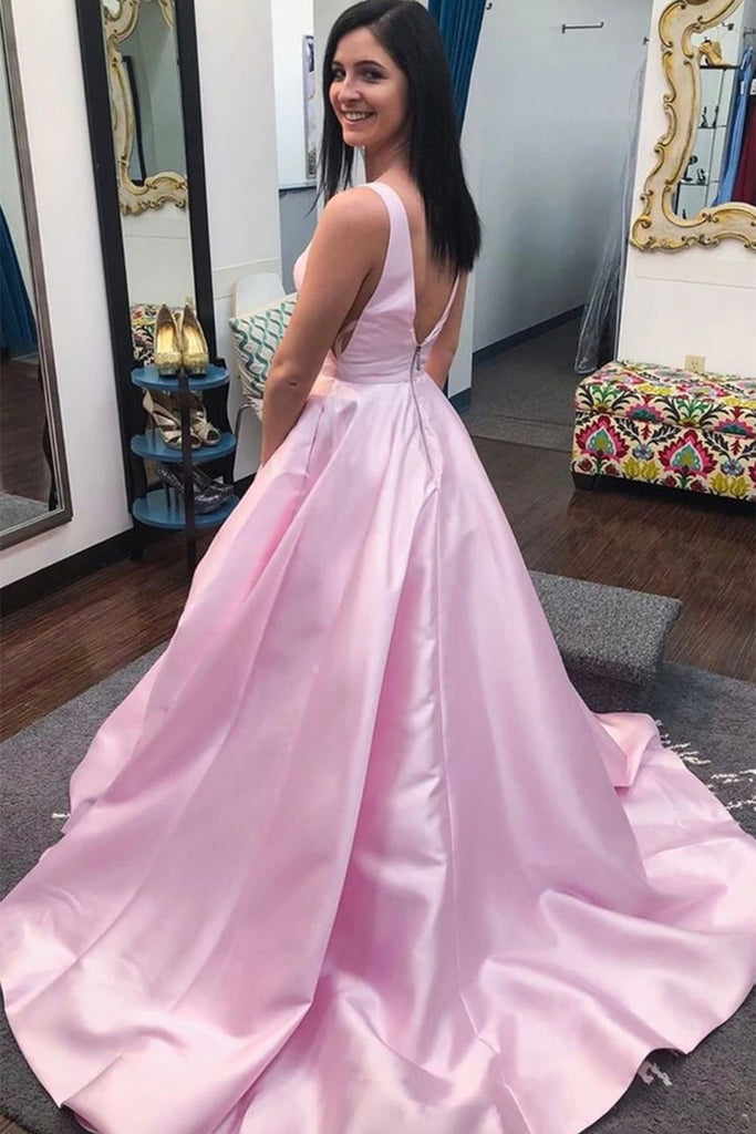 V Neck and V Back Pink Satin Long Prom Dresses, V Neck Pink Formal Graduation Evening Dresses EP1902