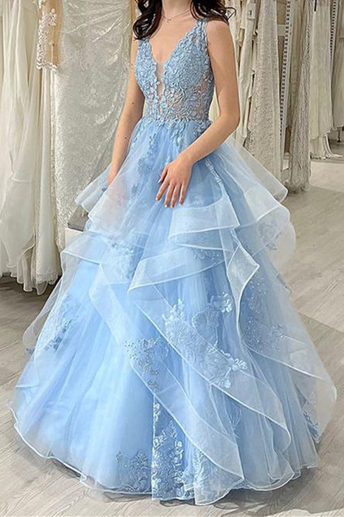 V Neck Blue Lace Prom Dresses, Blue Lace Long Formal Evening Dresses