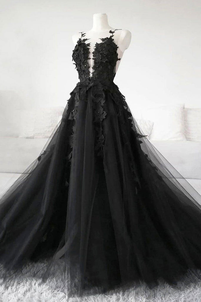 V Neck Open Back Black Tulle Lace Floral Long Prom Dresses, Black Lace Formal Evening Dresses with Appliques EP1688