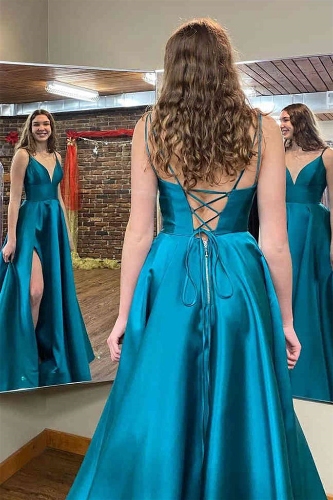 V Neck Open Back Blue Satin Long Prom Dresses with High Slit, Blue Formal Graduation Evening Dresses with Pocket EP1848