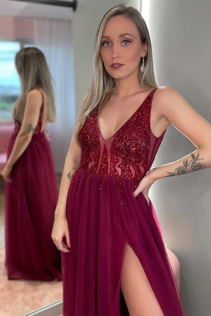 V Neck Open Back Gray/Burgundy Tulle Beaded Long Prom Dresses with High Slit, Grey/Burgundy Tulle Beaded Formal Evening Dresses EP1816