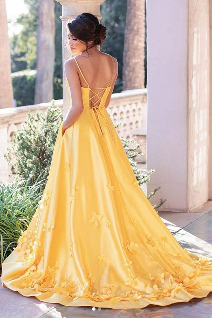 V Neck Open Back Yellow Satin Long Prom Dresses with Flowers, Long Yellow Floral Formal Evening Dresses EP1443